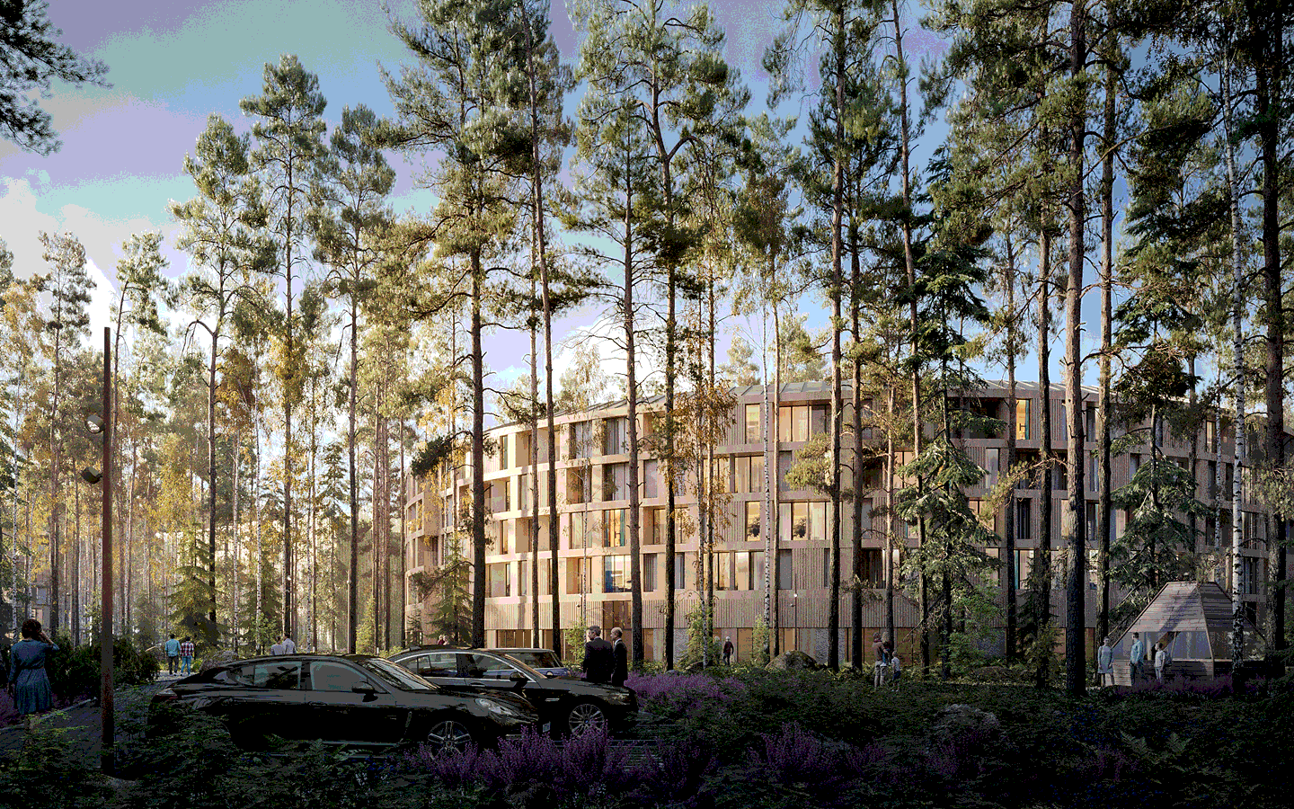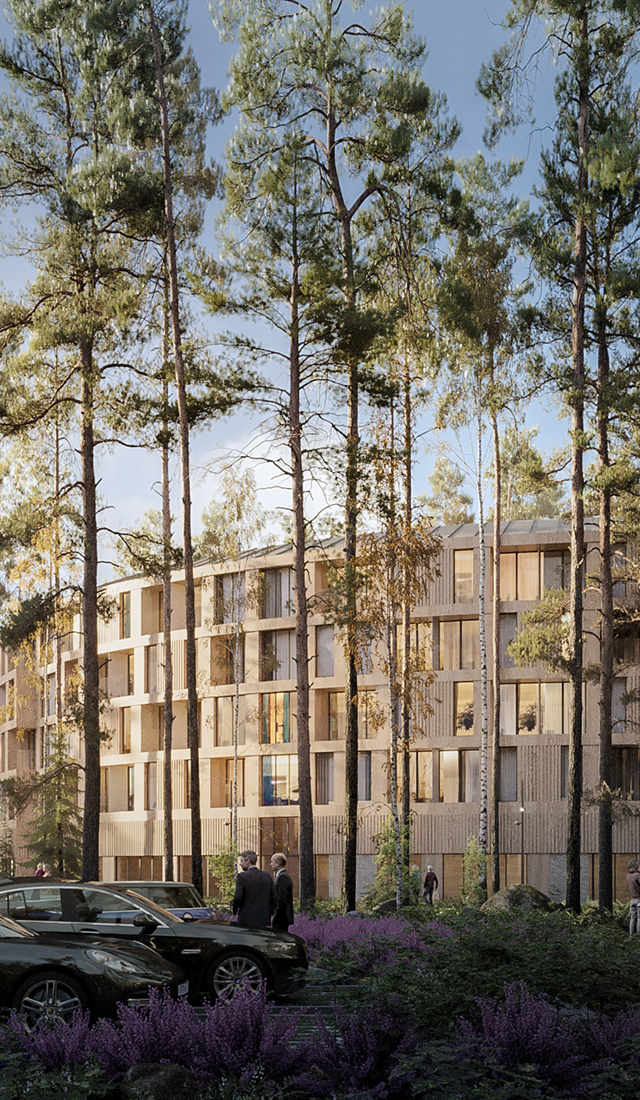 Фасадная композициявыполнена в благородных тонах с использованием премиальных материалов, а панорамное остекление открывает захватывающие виды на исторический парк.