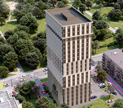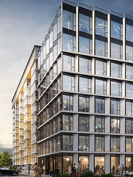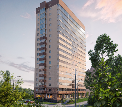 Фасадная композиция, выполненная в утонченной урбанистической эстетике, завораживает игрой света и тени. Керамические панелиблагородных оттенков в сочетании с зеркальным остеклением создают эффектный образ, который меняется с каждым движением солнца.